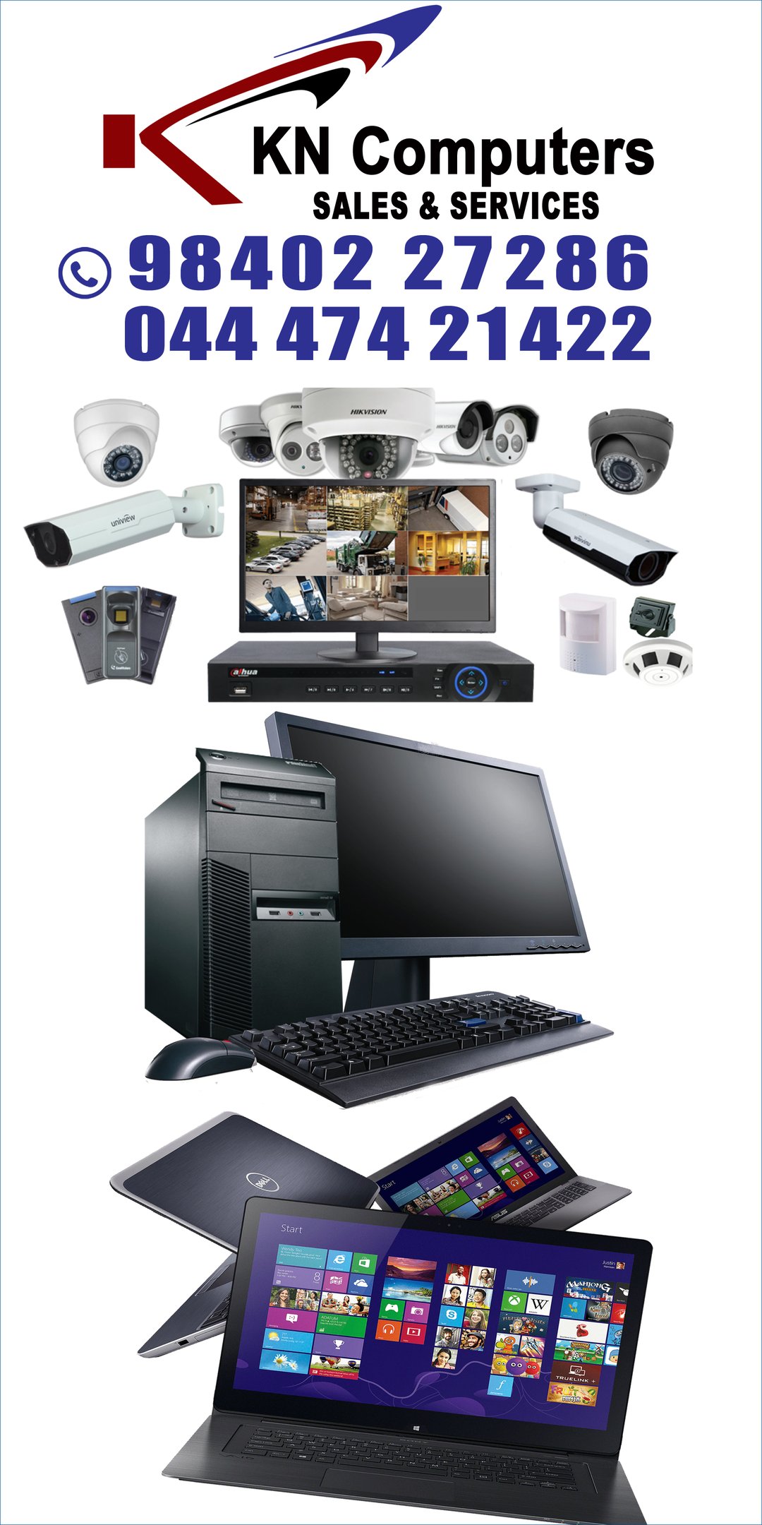 KN COMPUTERS offers comprehensive computer services, sales, and support. We specialize in desktop and laptop repair, printer maintenance, and CCTV installation. Serving the local community, we provide reliable solutions for homes and businesses, ensuring your tech runs smoothly. Contact us for expert assistance!